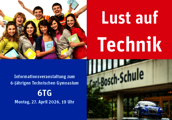 Am Montag, den 27.04.2026, findet um 19 Uhr unser Informationsabend für das 6-jährige Technische Gymnasium (ab Klasse 8) im Raum 001 an unserer Schule statt.